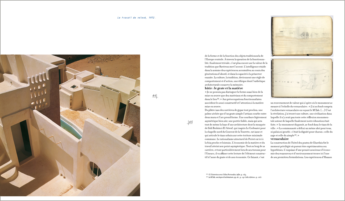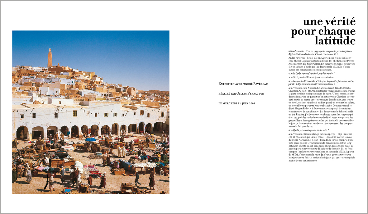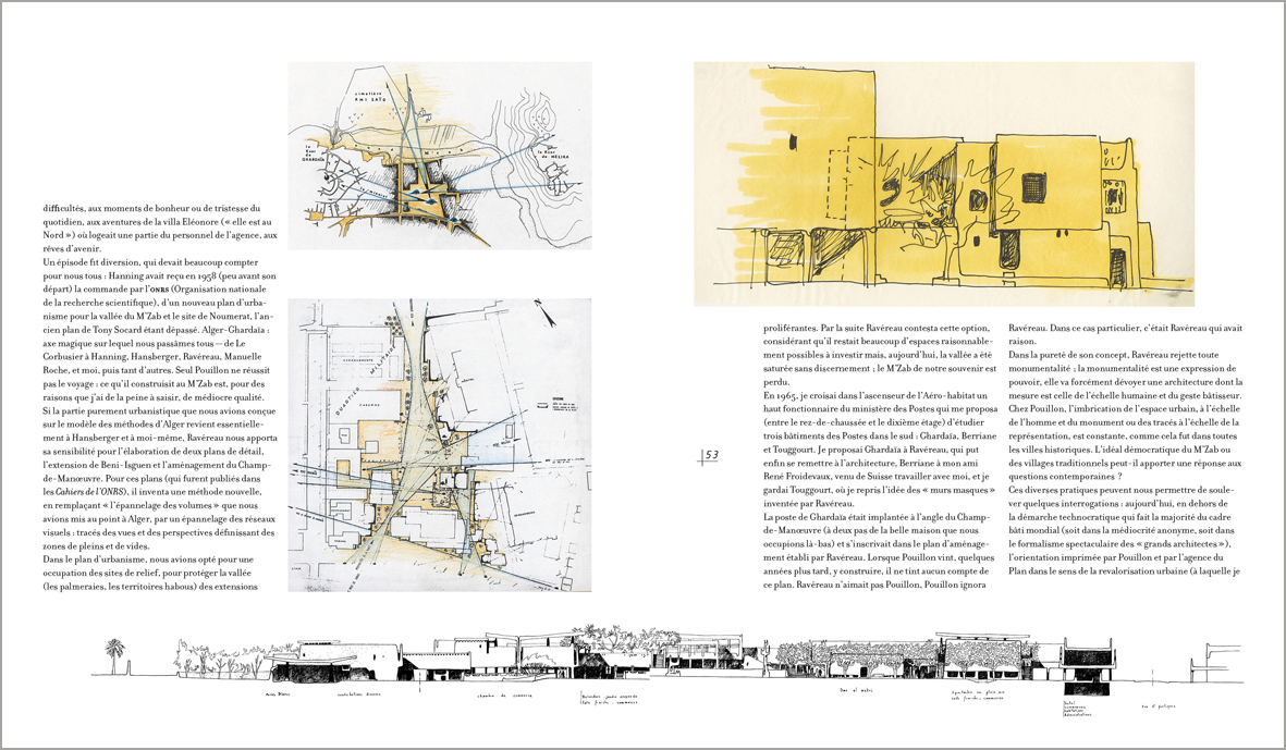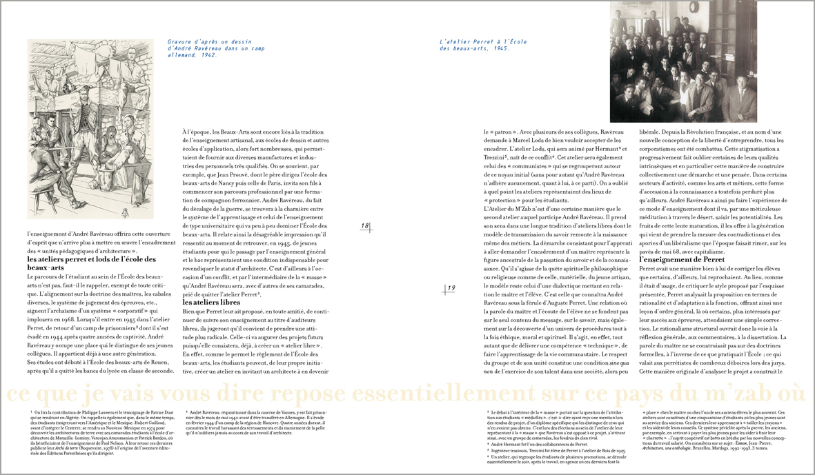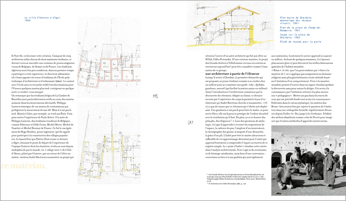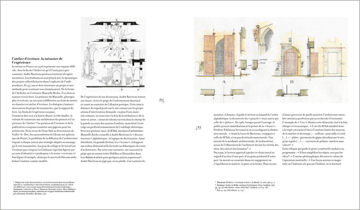 Lorsque André Ravéreau découvre les cités du M’Zab, par‑delà le choc émotionnel, il prend conscience de ce que peut apporter cette architecture dans la définition de nouvelles pratiques. Et c’est pour renforcer sa compréhension du lieu qu’il y anime un atelier destiné à perpétuer et à protéger ce patrimoine ; un « atelier du désert » qui verra se succéder plusieurs générations de jeunes architectes venus se confronter à cette gestion du territoire tout à la fois respectueuse du contexte naturel et des cultures locales. Une véritable leçon d’architecture où le bâti reprend sans fioritures l’expression d’un mode de vie « situé ».