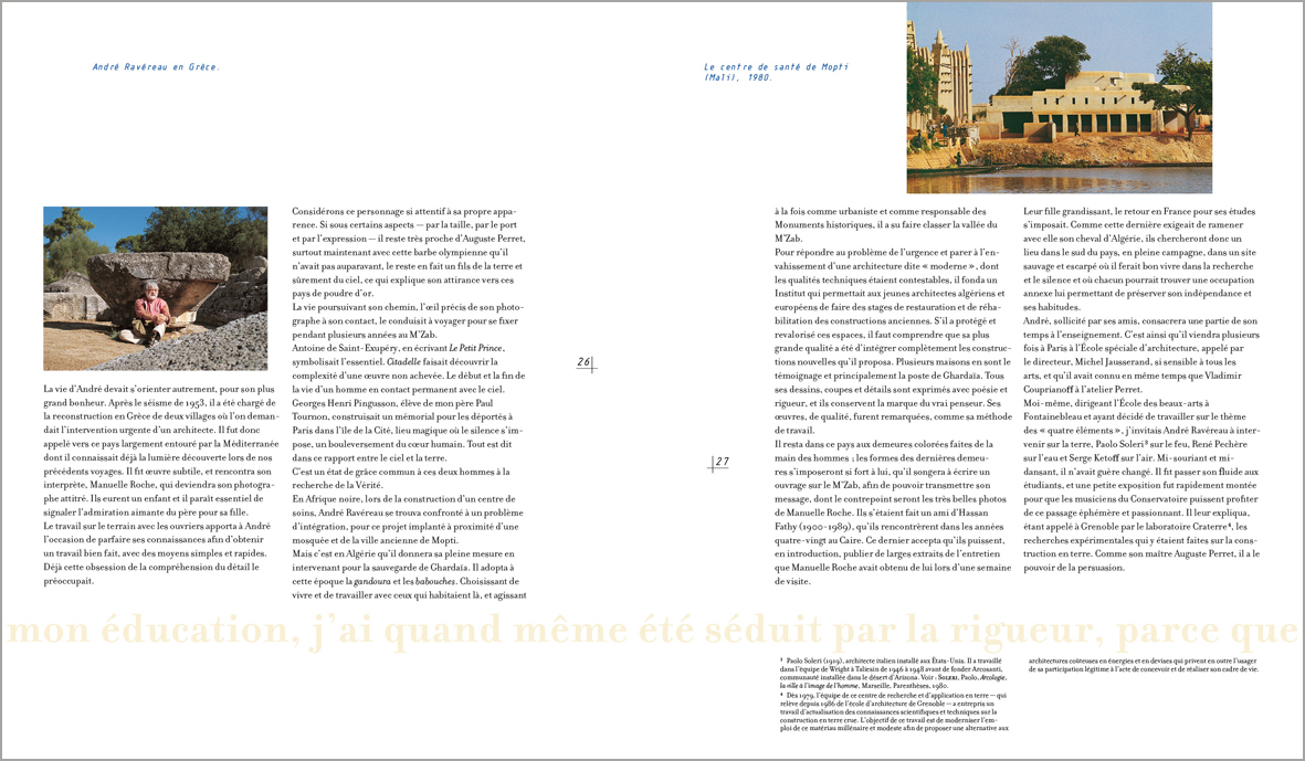Lorsque André Ravéreau découvre les cités du M’Zab, par‑delà le choc émotionnel, il prend conscience de ce que peut apporter cette architecture dans la définition de nouvelles pratiques. Et c’est pour renforcer sa compréhension du lieu qu’il y anime un atelier destiné à perpétuer et à protéger ce patrimoine ; un « atelier du désert » qui verra se succéder plusieurs générations de jeunes architectes venus se confronter à cette gestion du territoire tout à la fois respectueuse du contexte naturel et des cultures locales. Une véritable leçon d’architecture où le bâti reprend sans fioritures l’expression d’un mode de vie « situé ».